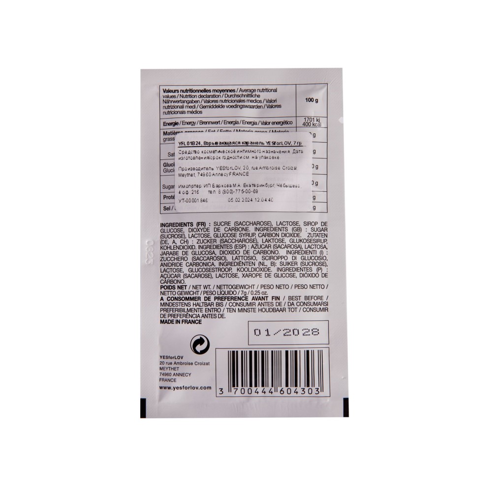 Состав на основе натуральных компонентов: сахар (сахароза), лактоза, глюкозный сироп и диоксид углерода. Упакован в удобное саше для гигиеничного использования. Французское качество гарантирует безопасность и непревзойденные ощущения.