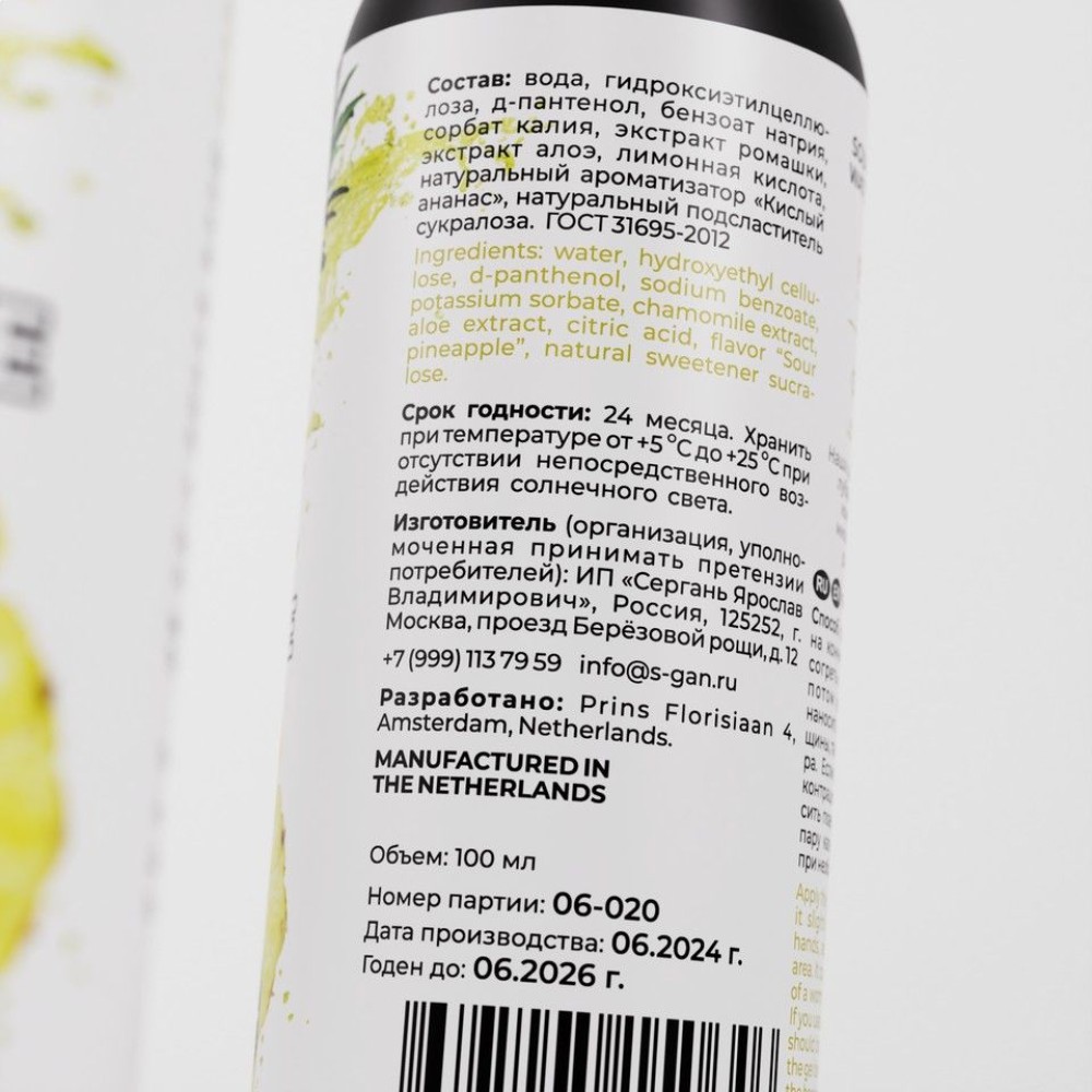 | Функциясмазка для орального секса | Доп. функциясмазка для вагинального секса | Составвода, гидроксиэтилцеллюлоза, д-пантенол, бензоат натрия, сорбат калия, экстракт ромашки, экстракт алоэ, лимонная кислота, натуральный ароматизатор Кислый ананас, натуральный подсластитель (сукралоза). |