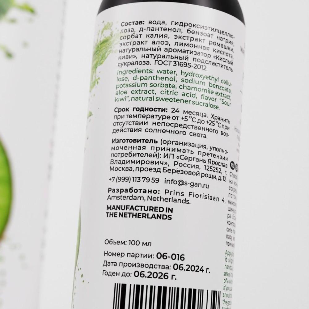| Функциясмазка для орального секса | Доп. функциясмазка для вагинального секса | Составвода, гидроксиэтилцеллюлоза, д-пантенол, бензоат натрия, сорбат калия, экстракт ромашки, экстракт алоэ, лимонная кислота, натуральный ароматизатор Кислое киви, натуральный подсластитель (сукралоза). |