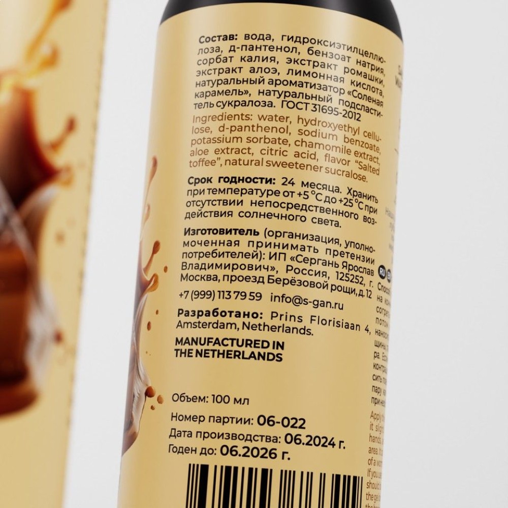 | Функциясмазка для орального секса | Доп. функциясмазка для вагинального секса | Составвода, гидроксиэтилцеллюлоза, д-пантенол, бензоат натрия, сорбат калия, экстракт ромашки, экстракт алоэ, лимонная кислота, натуральный ароматизатор Соленая карамель, натуральный подсластитель (сукралоза). |