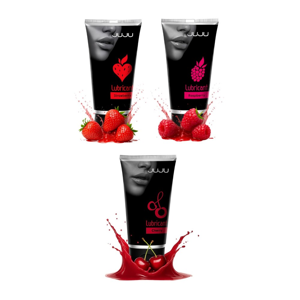 Набор из 3 съедобных лубрикантов JUJU с насыщенными вкусами клубники, малины и вишни. Идеально подходит для обоих партнеров, выполняя роль смазки как для вагинального, так и для орального секса. Каждый флакон объемом 50 мл упакован в удобную тубу. Бренд и производство - Россия.