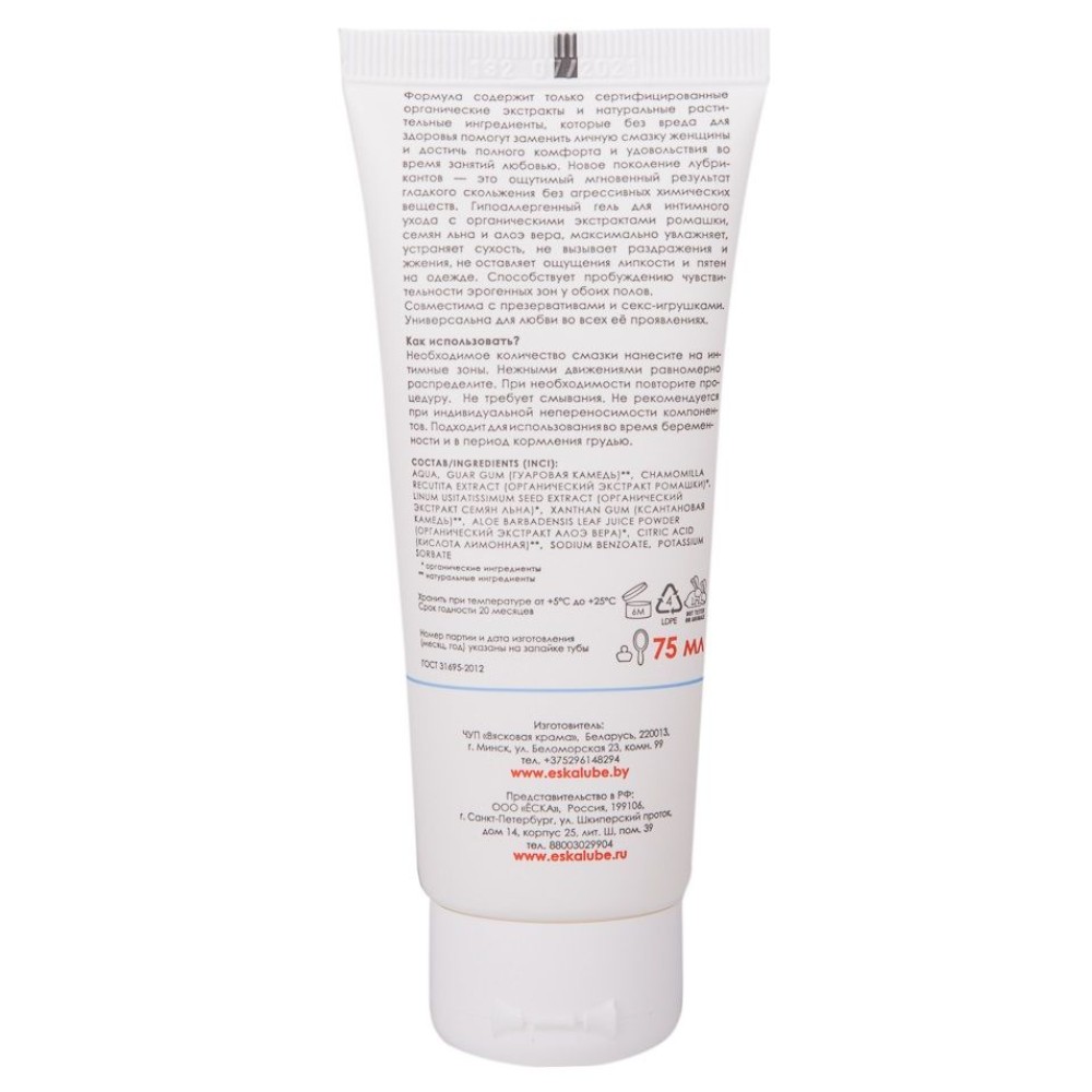 | Функциясмазка для вагинального секса | Доп. функцияувлажнение половых органов | Составвода, гуаровая камедь, органический экстракт ромашки, органический экстракт семян льна, ксантановая камедь, органический экстракт алоэ вера, кислота лимонная, бензоат натрия, сорбат калия |