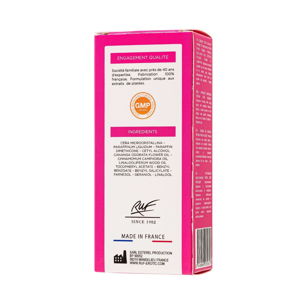 Формула крема содержит уникальную комбинацию натуральных масел и компонентов: цветочное масло иланг-иланга, камфорное масло, токоферила ацетат и другие активные ингредиенты, которые мягко стимулируют чувствительные зоны.