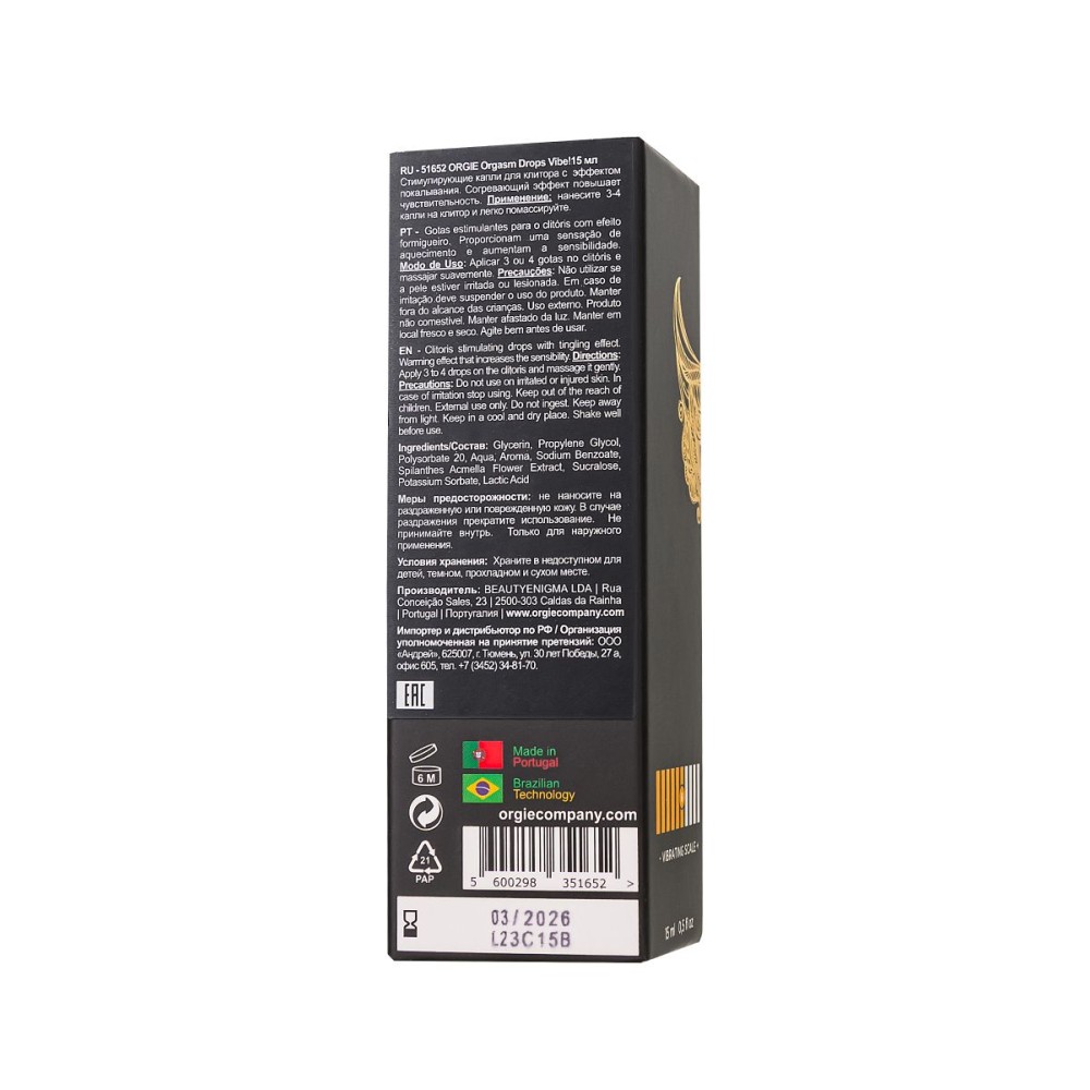Бренд из Португалии, производство в Бразилии. Упаковка — стильная картонная коробка, идеально подходит для подарка или личного использования. Подарите себе новые границы наслаждения с ORGIE Orgasm Drops Vibe!