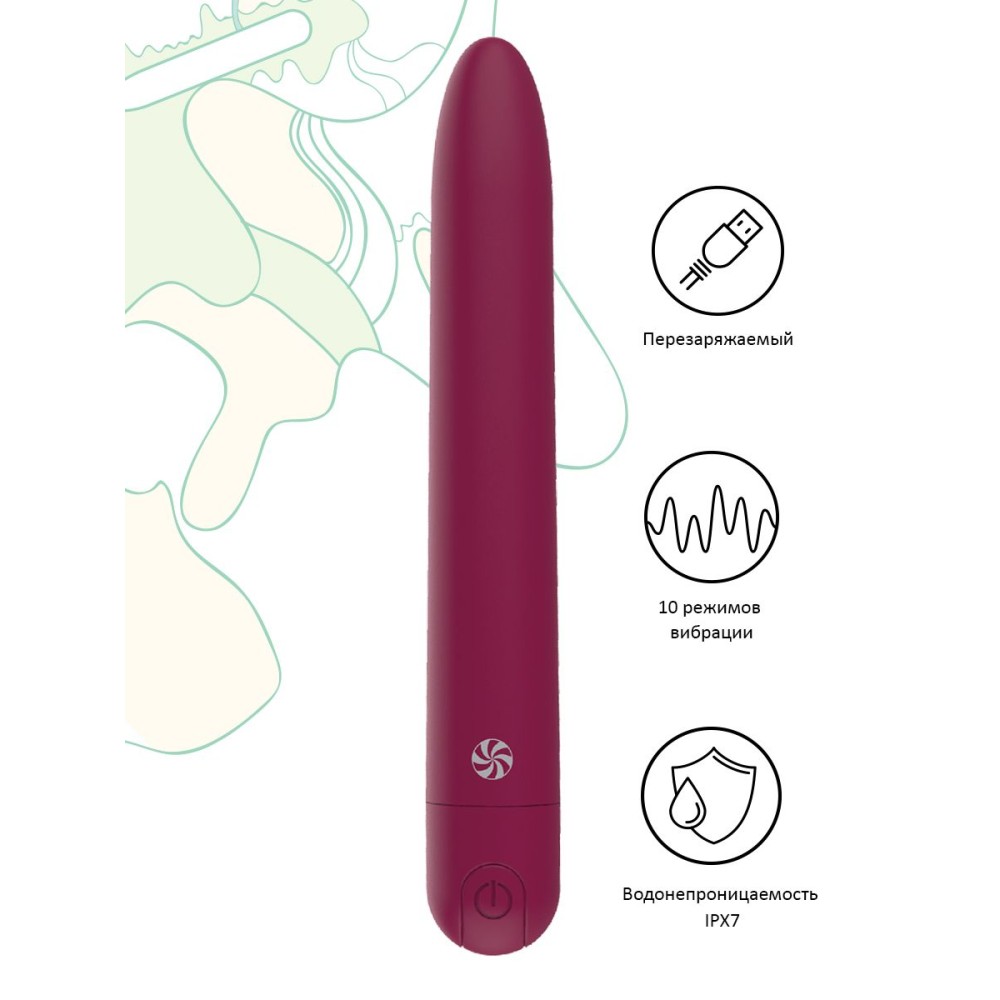 Изысканный вибратор насыщенного бордового оттенка для глубокой вагинальной стимуляции. Модель длиной 18 см и диаметром 3 см создана из высококачественного силикона, обеспечивающего нежное тактильное восприятие и гигиеничность использования.