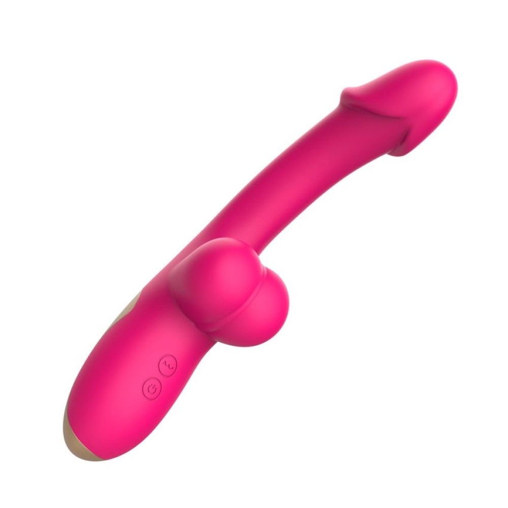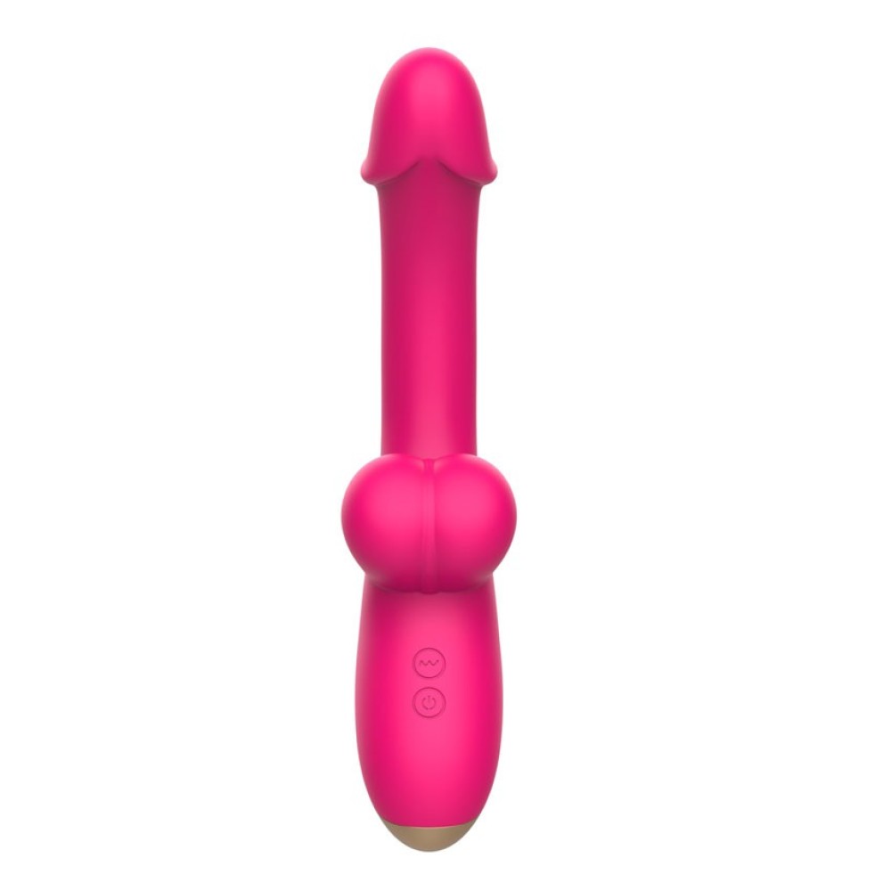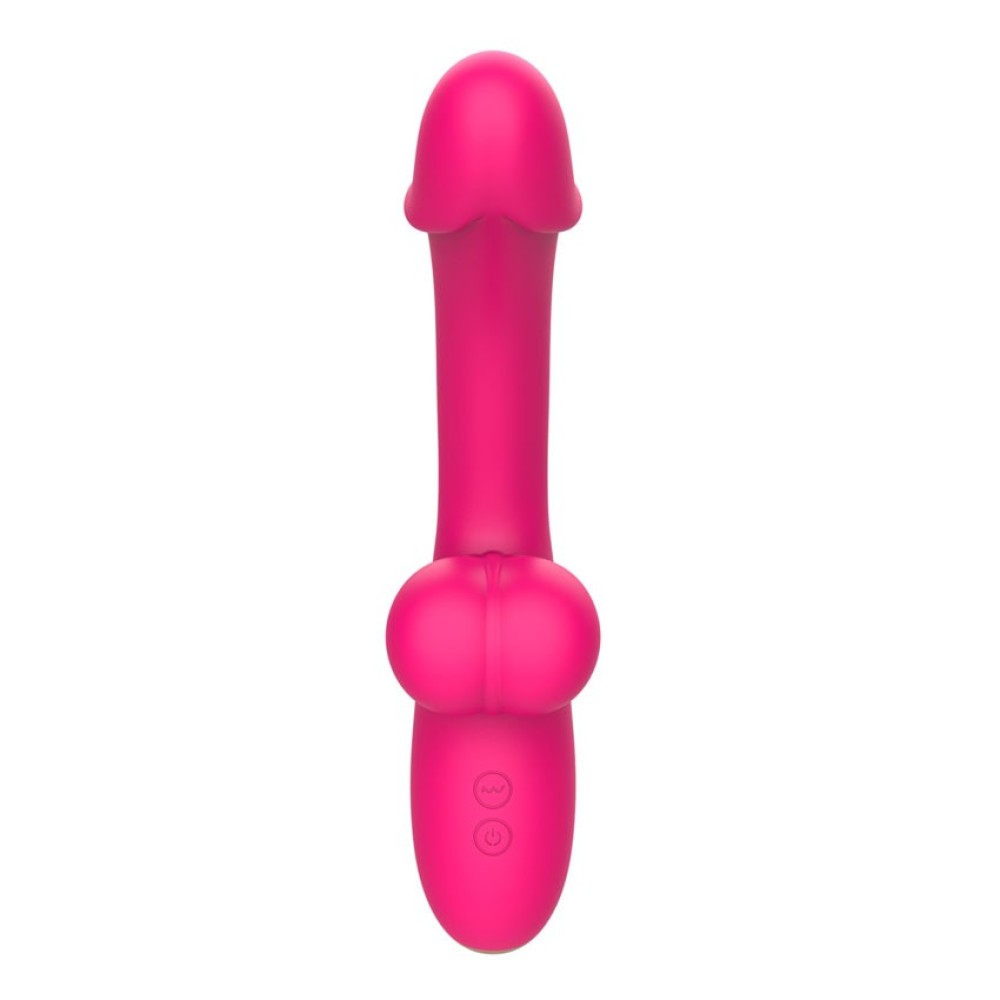 Розовый изогнутый вибромассажёр с имитацией мошонки - идеальный спутник для незабываемых моментов наслаждения! Стильный дизайн и продуманная форма созданы для максимального комфорта и эффективной стимуляции.