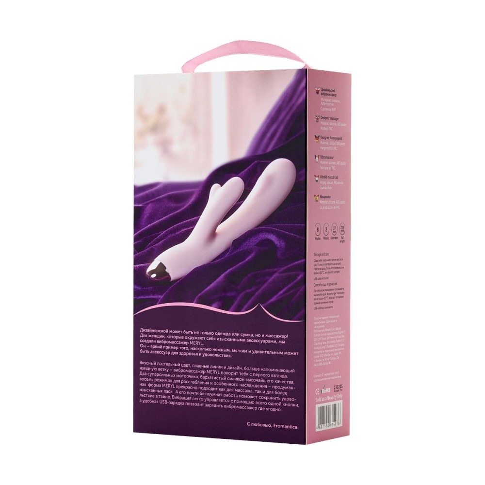 MERYL – яркий пример того, насколько нежным, мягким и удивительным может быть аксессуар для здоровья и удовольствия. Вкусный пастельный цвет, плавные линии и дизайн, больше напоминающий изящную ветку, – вибромассажер MERYL покорит с первого взгляда. Два супер сильных мотора, бархатистый силикон высочайшего качества, восемь режимов для расслабления и особенного наслаждения – продуманная форма MERYL прекрасно подходит как для массажа, так и для более изысканных ласк. А его почти бесшумная работа поможет сохранить удовольствие в тайне. Вибрация легко управляется с помощью всего одной кнопки, а удобная USB-зарядка позволит зарядить вибромассажер где угодно. Рабочая длина - 12,8 см.