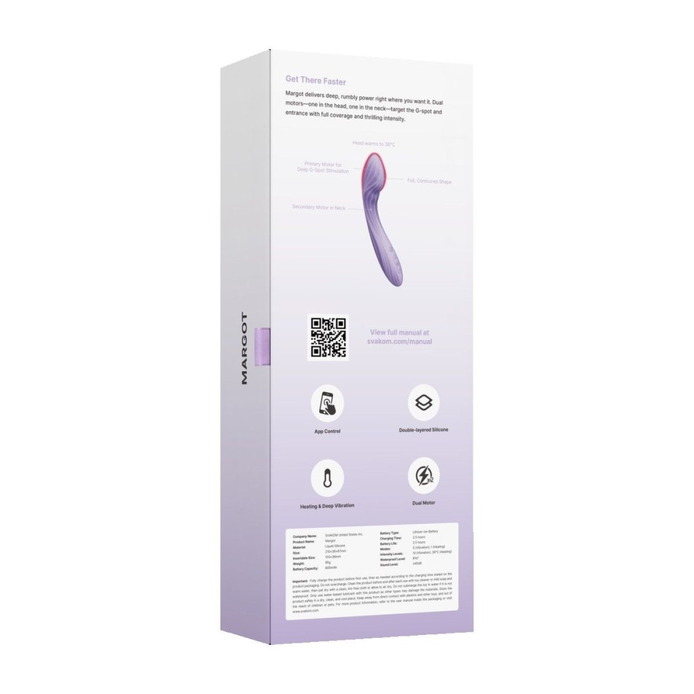 Представляем Margot, инновационный вибратор от SVAKOM, который удваивает ваше удовольствие благодаря двойным моторам, функции нагрева и элегантному дизайну. Это устройство создано для тех, кто ценит мощные ощущения, комфорт и современные технологии.